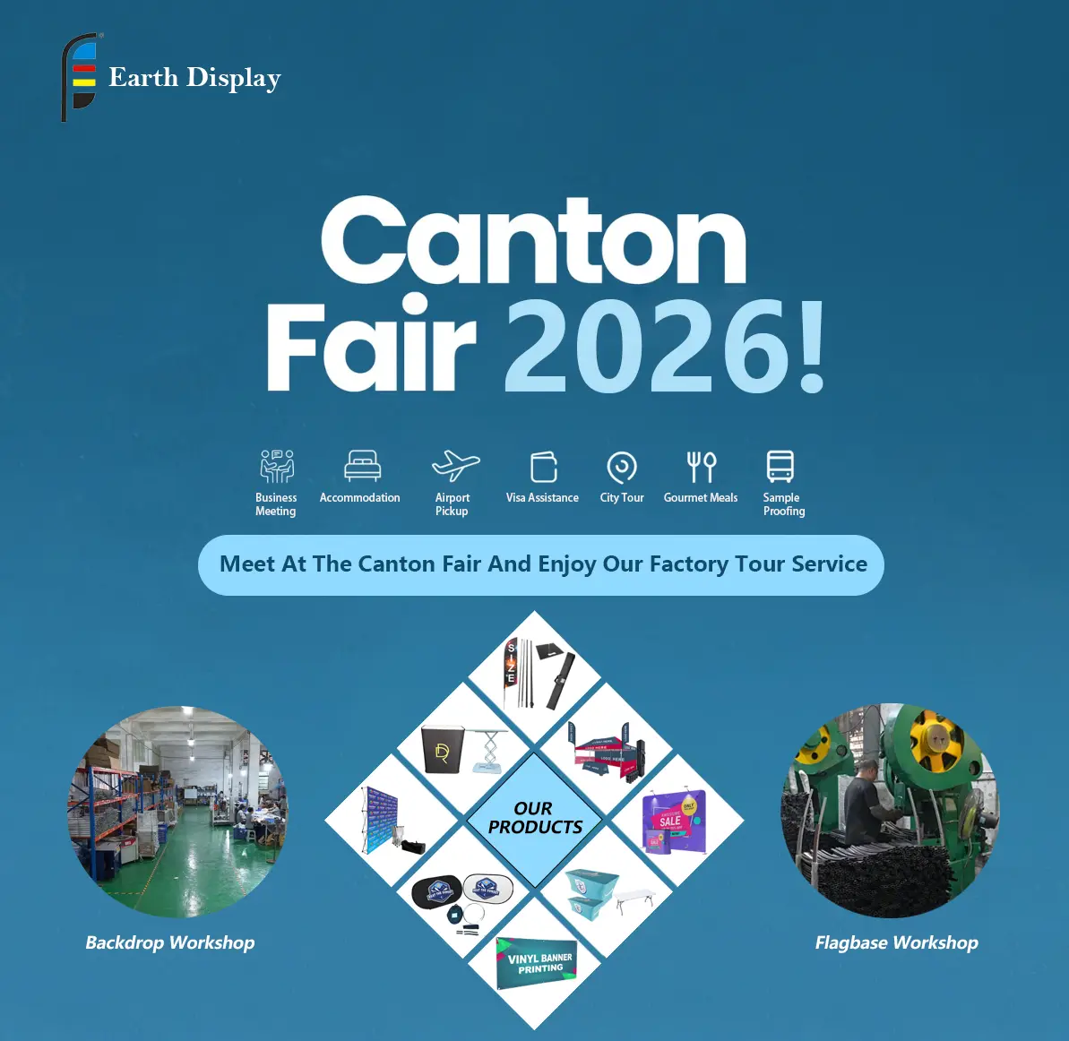 Canton Fair 2026 akan segera diadakan, dan kami di Earth Display sangat berharap dapat bertemu Anda di sana. Kami telah membuat bendera bulu, latar belakang pop-up, alas bendera, spanduk vinil khusus – pada dasarnya apa pun untuk pameran dan iklan – selama lebih dari sepuluh tahun hingga saat ini. Kali ini, dibandingkan hanya berbicara secara online, kami ingin menunjukkan kepada Anda apa yang kami lakukan, secara tatap muka.